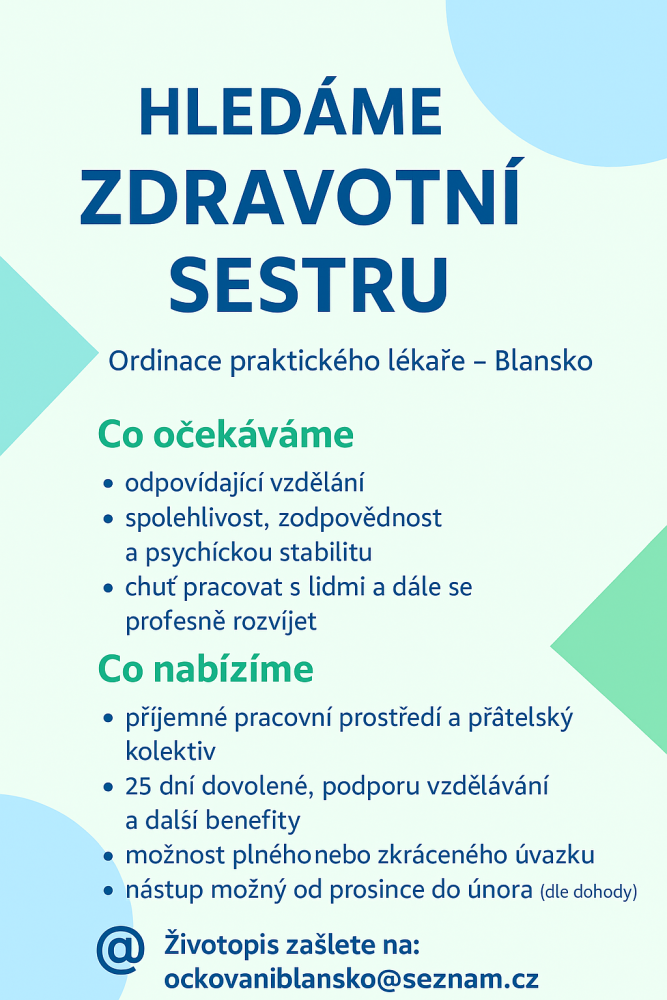 Co očekáváme • odpovídající vzdělání • spolehlivost, zodpovědnost a psychickou stabilitu • chuť pracovat s lidmi a dále se profesně rozvíjet Co nabízíme • příjemné pracovní prostředí a přátelský kolektiv • 25 dní dovolené, podpora vzdělávání a další benefity • možnost plného nebo zkráceného úvazku • nástup možný od prosince do února ( dle dohody)
