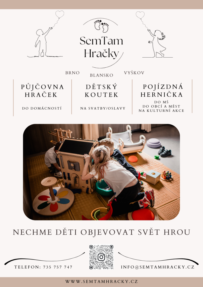 Přinášíme dětem radost a smysluplné hraní až k vám! Nabízíme pojízdnou herničku na akce, půjčovnu kvalitních hraček, i pronájem dětského koutku pro oslavy, svatby nebo firemní setkání. Hraní, které rozvíjí - s láskou, pohybem a fantazií.