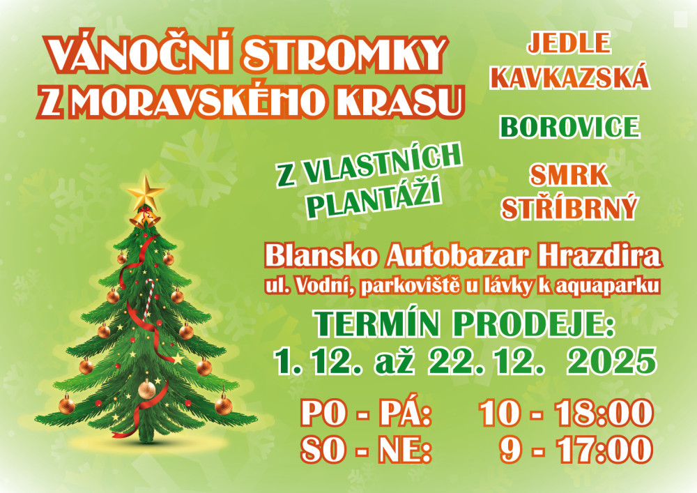 Šestým rokem budeme prodávat vánoční stromečky z místních plantáží u Rozstání. Naše stromečky jsou čerstvě řezané a v průběhu prodeje postupně doplňovány. Zabýváme se prodejem převážně jedle kavkazské od 1m-3,5m v ceně od 500 kč. V nabídce je i smrk stříbrný a borovice. Prodej bude probíhat denně od 1.12.2025 v blansku na ulici Vodní, vedle autobazaru Hrazdíra, u lávky k aquaparku. PO-PÁ 10:00-18:00 SO-NE 9.00-17:00. Děkujeme za podporu Českého vánočního stromečku z Moravského krasu.