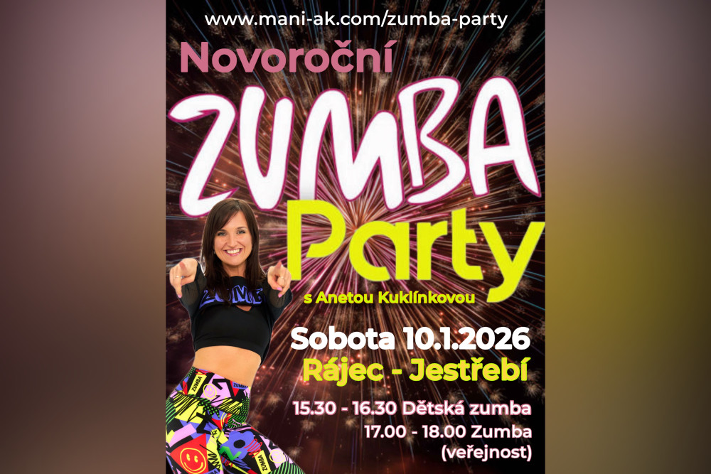 ⭐️Novoroční zumba party⭐️ s Anetou ,,Áňou” Kuklínkovou ✨Kdy? Sobota 10.1.2026 ✨Kde? Sokolovna Rájec - Jestřebí 15.30 - 16.30 - Dětská zumba party (doporučený věk +- 5 - 12 let, může se samozřejmě přidat kdokoli) 17.00 - 18.00 - Zumba party ✨Vstupné v předprodeji: 160,- Kč Odkaz na vstupenky zde - www.mani-ak.com/zumba-party/ (vložte do košíku a postupujte dál dle pokynů e-shopu, pokud máte problém, pište na e-mail info@anetakuklinkova.cz) Předprodej končí v páteční poledne 9.1.2026 Vstupné na místě: 200,- Kč ⭐️Těšit se můžete na pravou zumba atmosféru, dárečky i tombolu!⭐️ Zavzpomínáme na nejlepší zumba choreografie!♥️